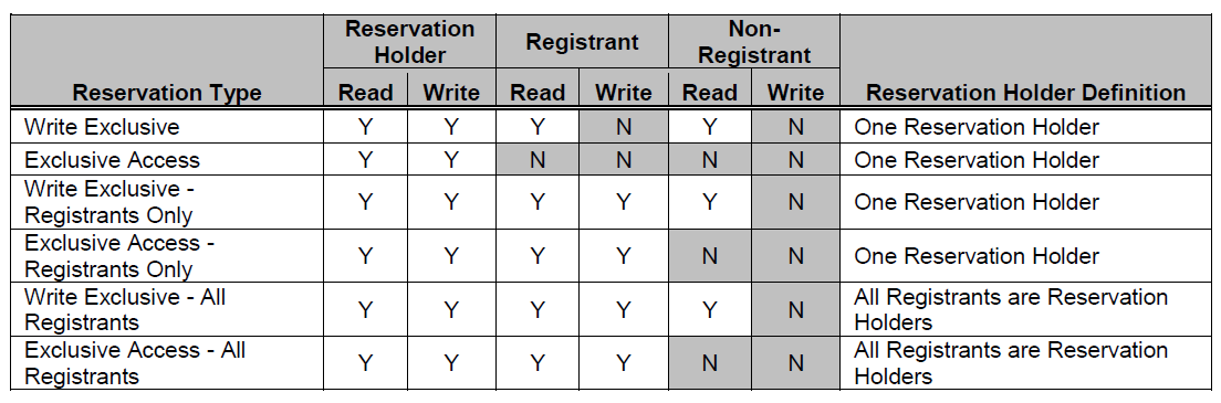 The differences between these reservation types are: the type of access that is excluded (i.e., writes or all accesses), whether registrants have the same access rights as the reservation holder, and whether registrants are also considered to be reservation holders.